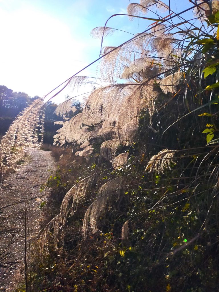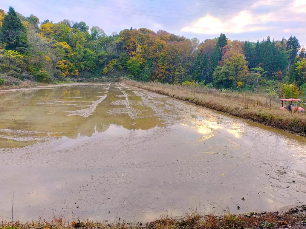 半袖姿、汗をかきながらやっていた耕うん・代かき作業も、いつの間にか季節が巡って、上下インナーを着込みネックウォーマーまでするような気温になりました。周囲の山々はすっかり紅葉して、すすきの穂があちこちでふんわりなびいています。