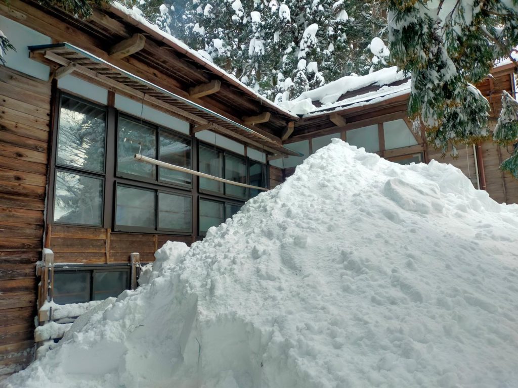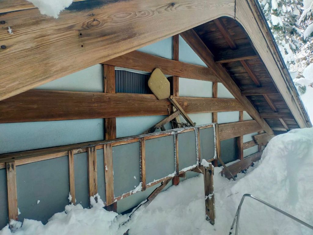 今日、屋根に登って雪下ろしをしていた最中、昔のこの家の住人の方が使っていた雪流しの道具が気に留まりました。滑り台みたいに加工してある長い板で、屋根から雪を落とすときにこの板に乗せてすべらせると遠くまで運び落とせるという道具です。