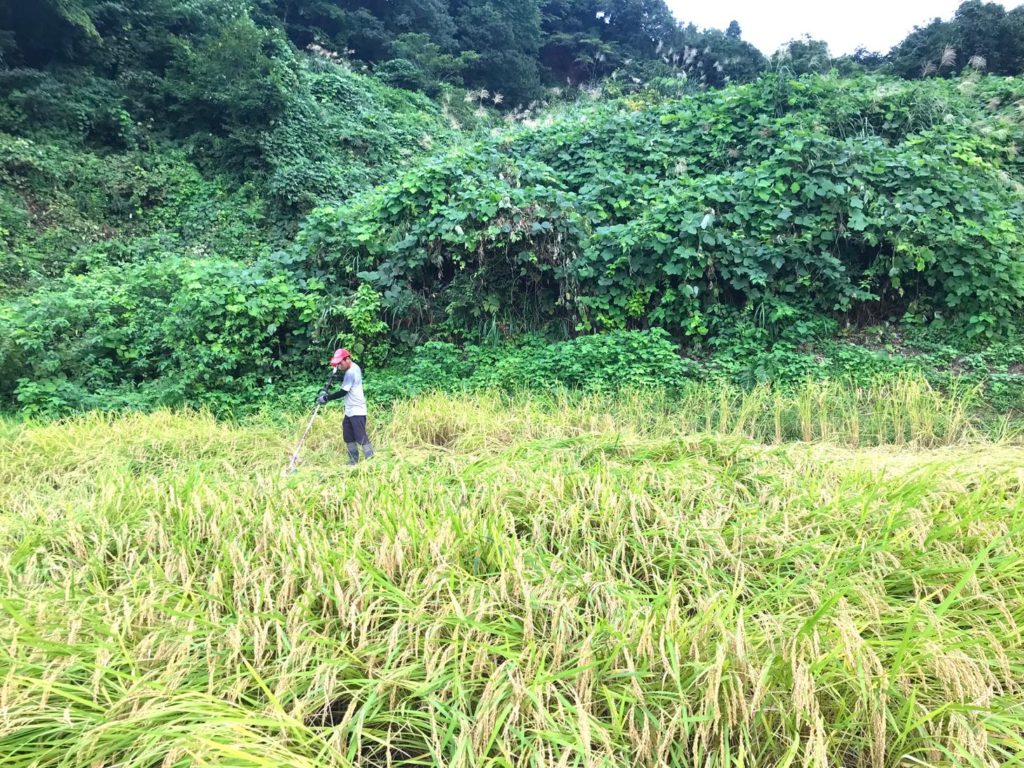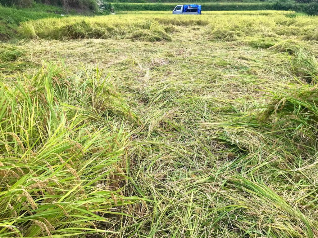 それでも、万が一、わが家のお米を食べてくださるみなさんが嫌な思いをしたらと案じ、念には念をおして、イノシシが通ったところや踏み荒らされたところの稲を、草刈機で切り刻んで、収穫できないようにしました。